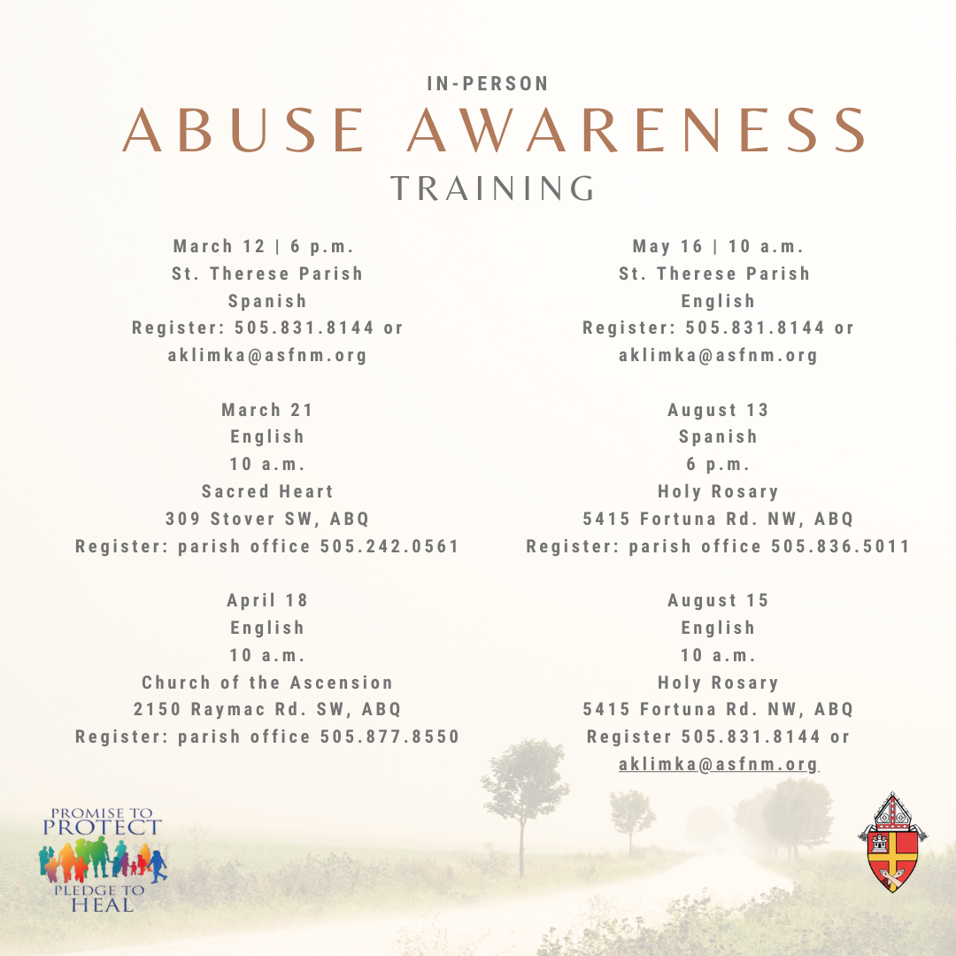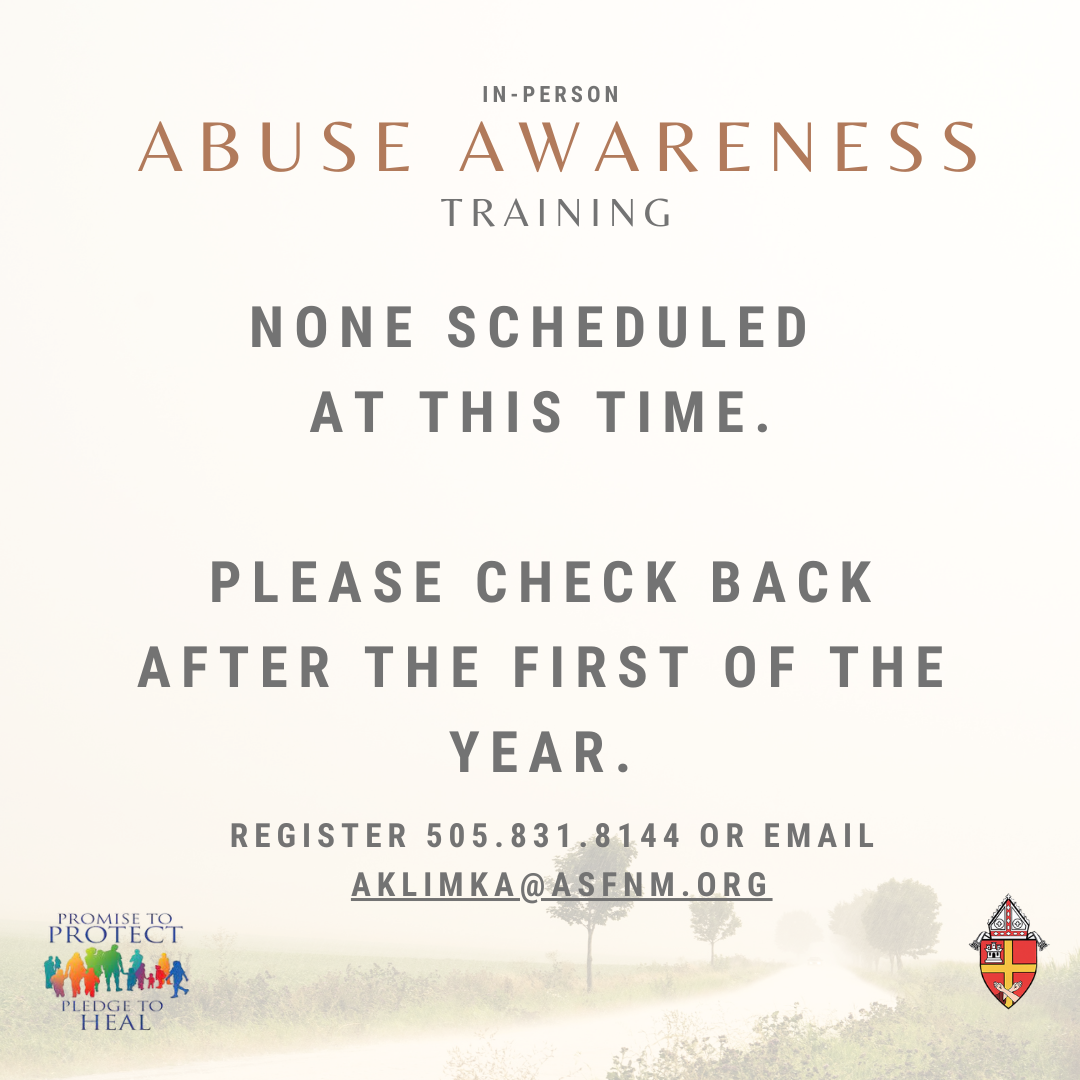The first Archdiocese of Santa Fe policy relating to sexual misconduct was promulgated on July 1, 1990. The ASF Policy was one of the first in the USA to require that any knowledge of sexual abuse of a minor be immediately reported to proper law enforcement authorities. Since 1990, thousands of paid personnel, volunteers, and parents have participated, as required, in workshops to be better informed and learn what we must do together to ensure that the home, school, workplace, and Church are safe environments. In an effort to provide guidance and direction, we periodically review our policy and update it as needed to prevent sexual misconduct and harassment. The revised policy was promulgated by Archbishop John C. Wester on June 28, 2024. En Español